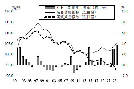 (図1) 名目賃金 実質賃金 消費者物価の推移 賃金指数は毎勤統計就業形態計5人以上規模 (出所: 内閣府)