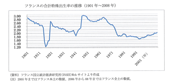 (図表2)フランスの合計特殊出生率の推移(1901〜2008年) 出所)参議院「立法と調査」2009年10月号